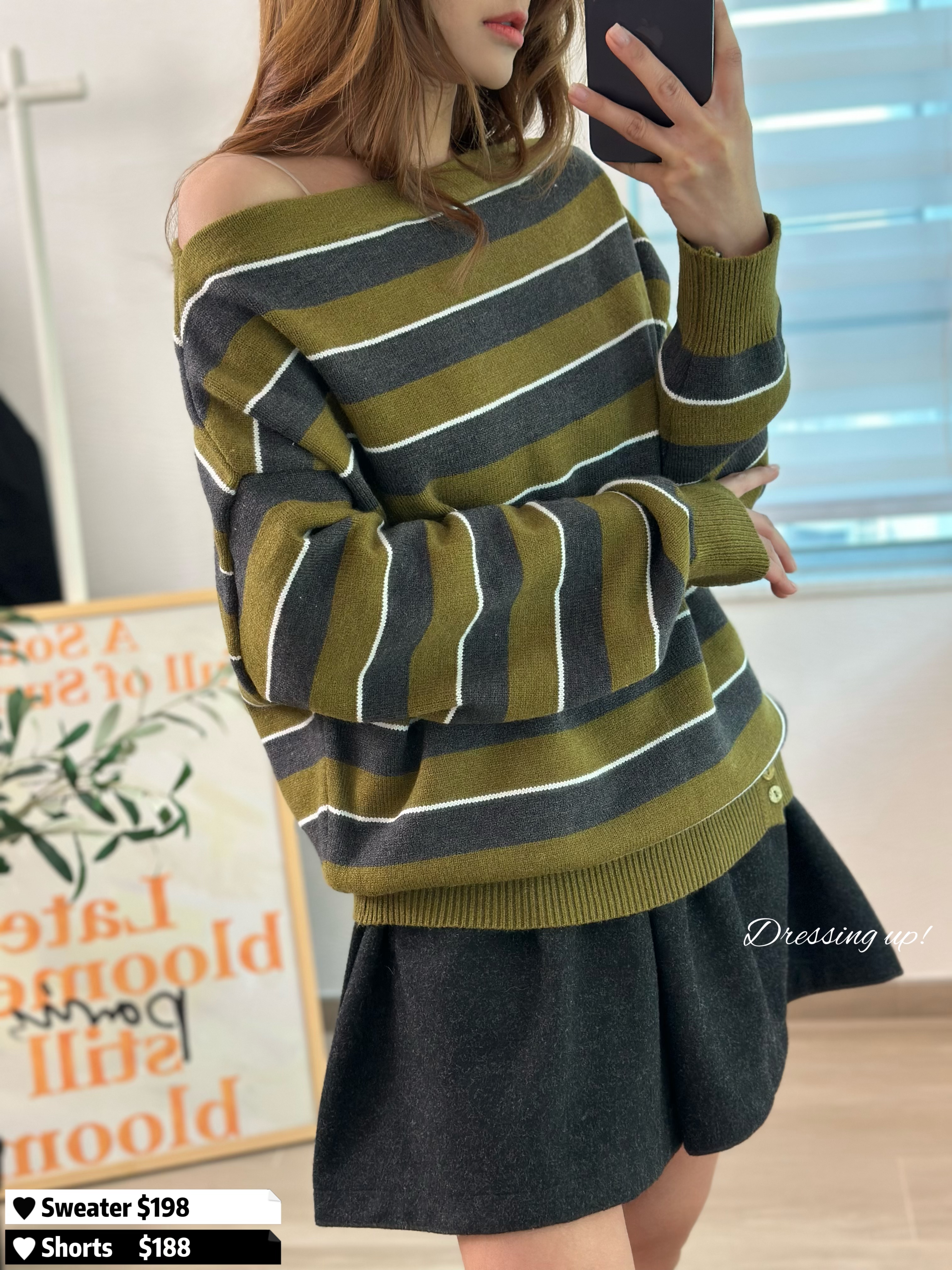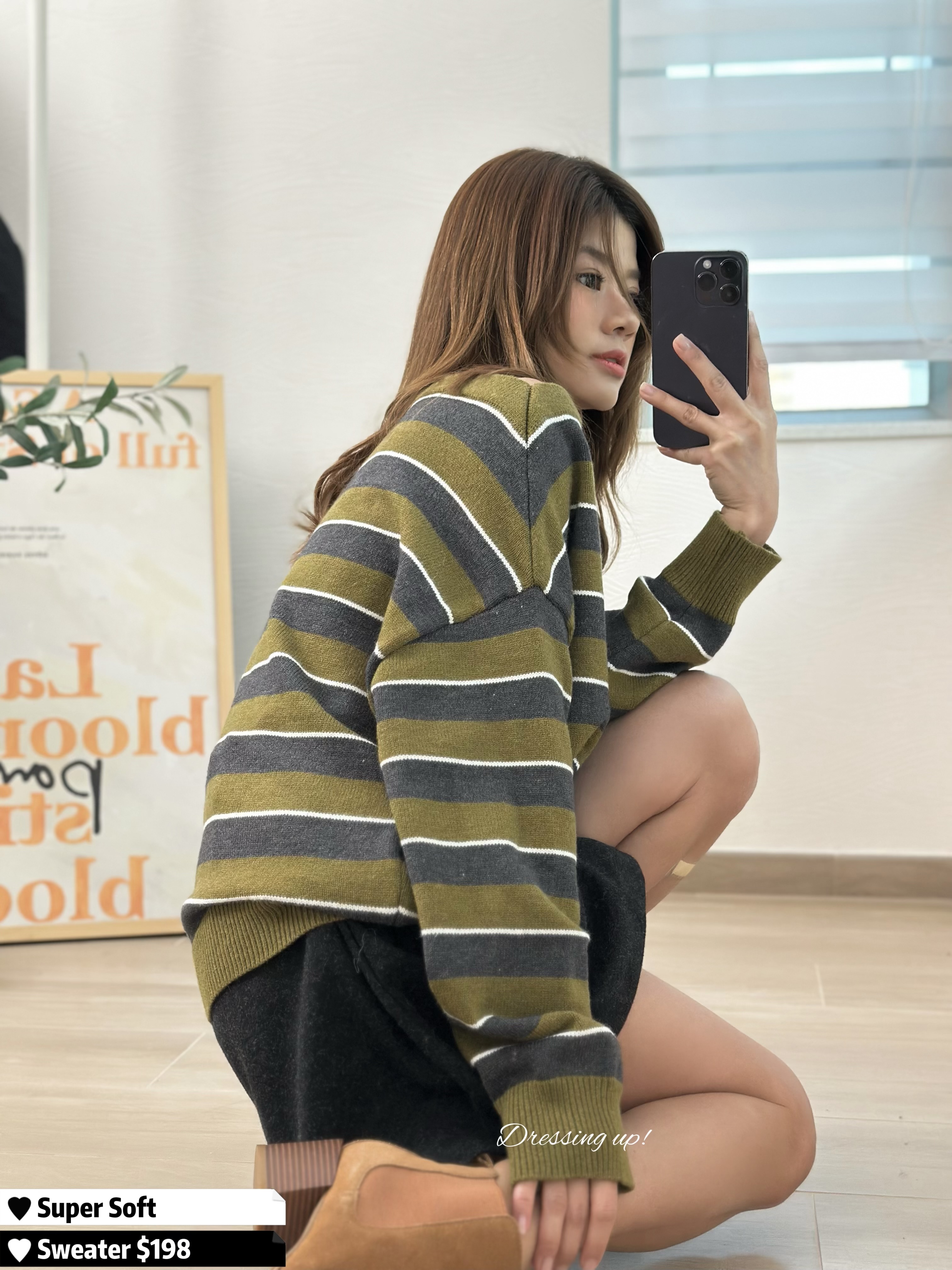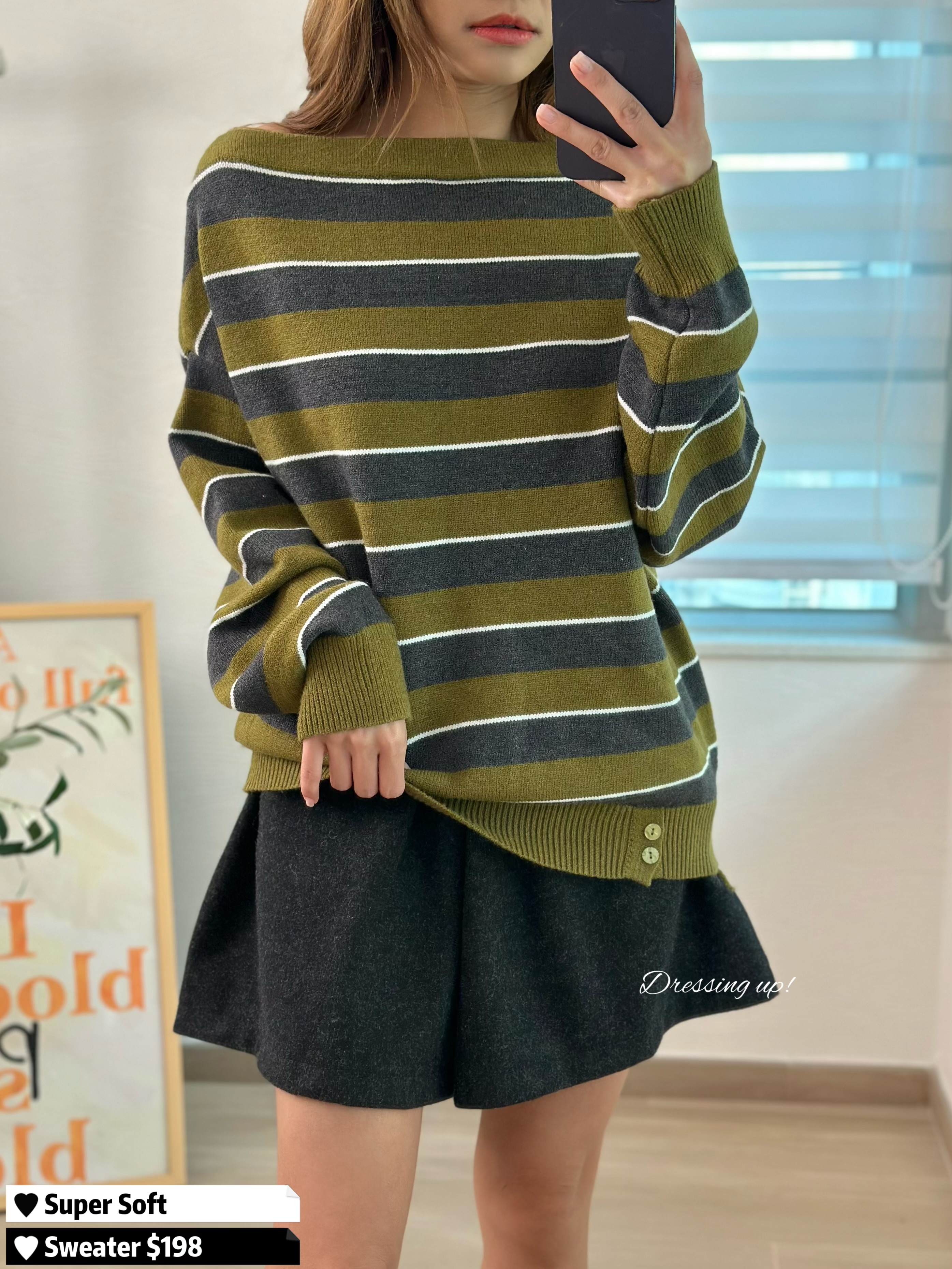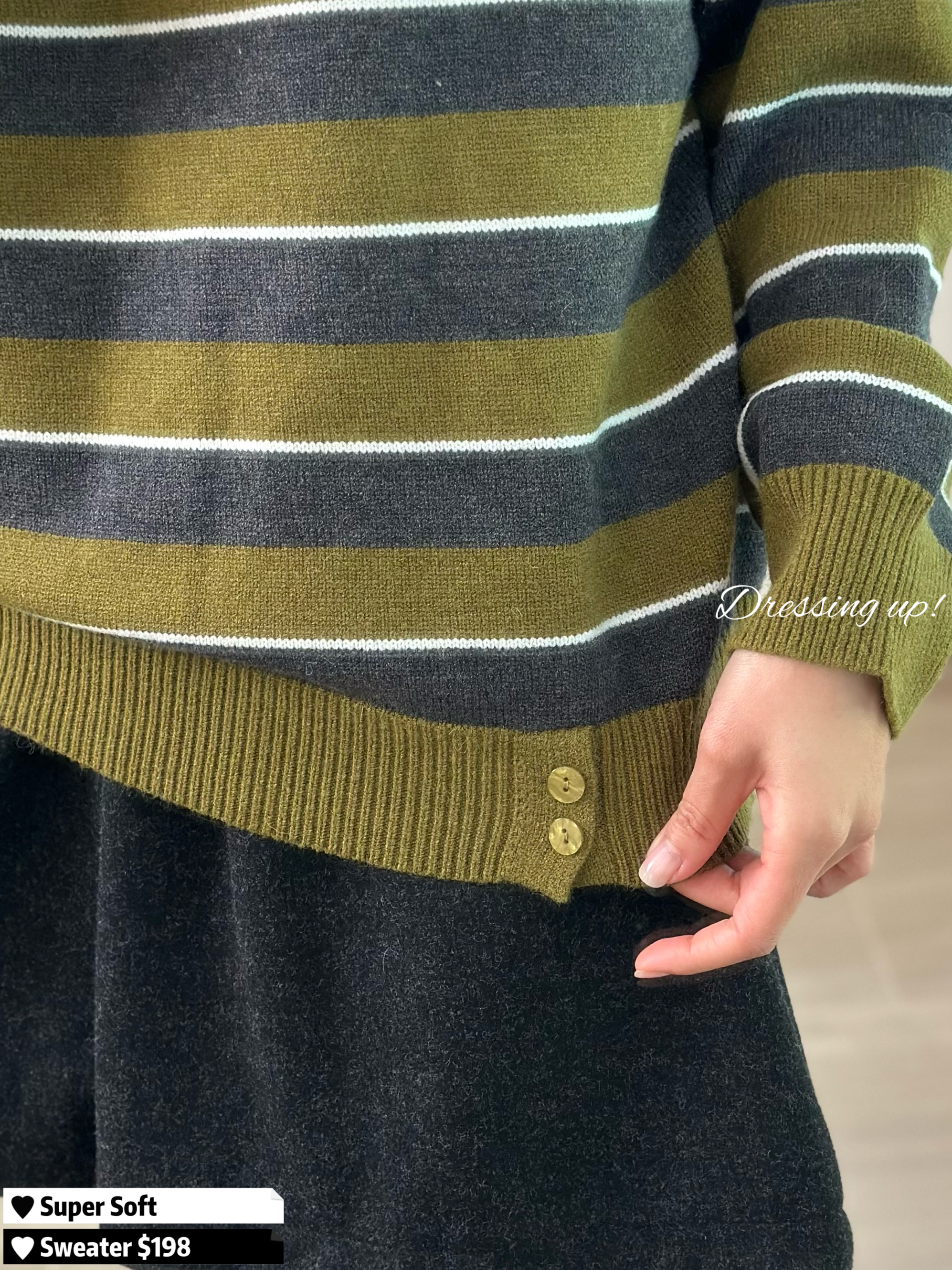 #恰到好處 🏷️ 哇!有綠色粉絲嗎 😍⁉️ 極軟條紋針織 深灰拼綠色、質地軟到不得了 當聖誕衫都靚喎 ~~ 一字膊恰到好處 也可拉做跌膊款 襯我哋嘅絨褲好掂 🥰👍🏻 🆕 恰到好處|條紋極軟針織 🆕 胸44-54吋/腰32-44吋/長58cm