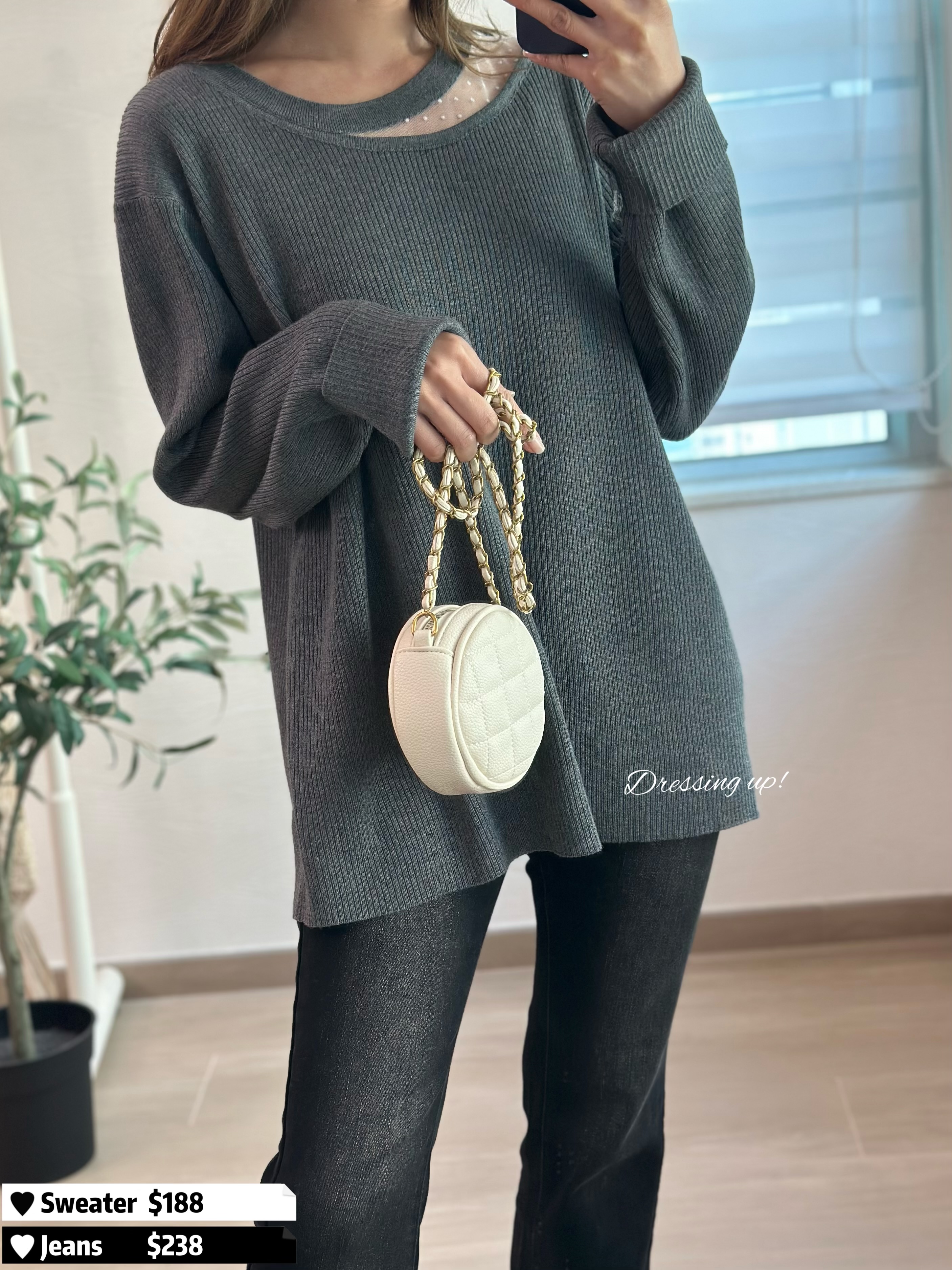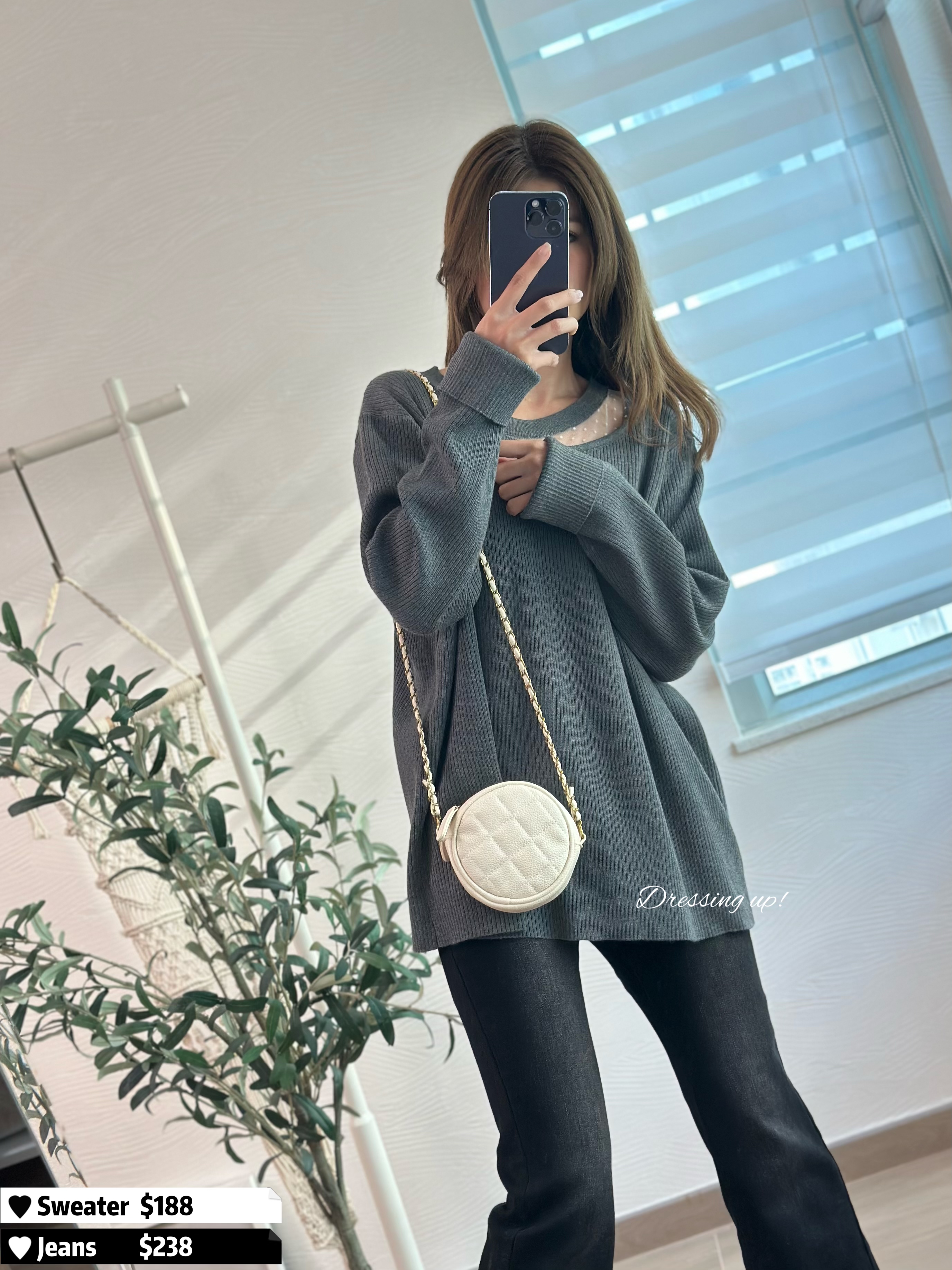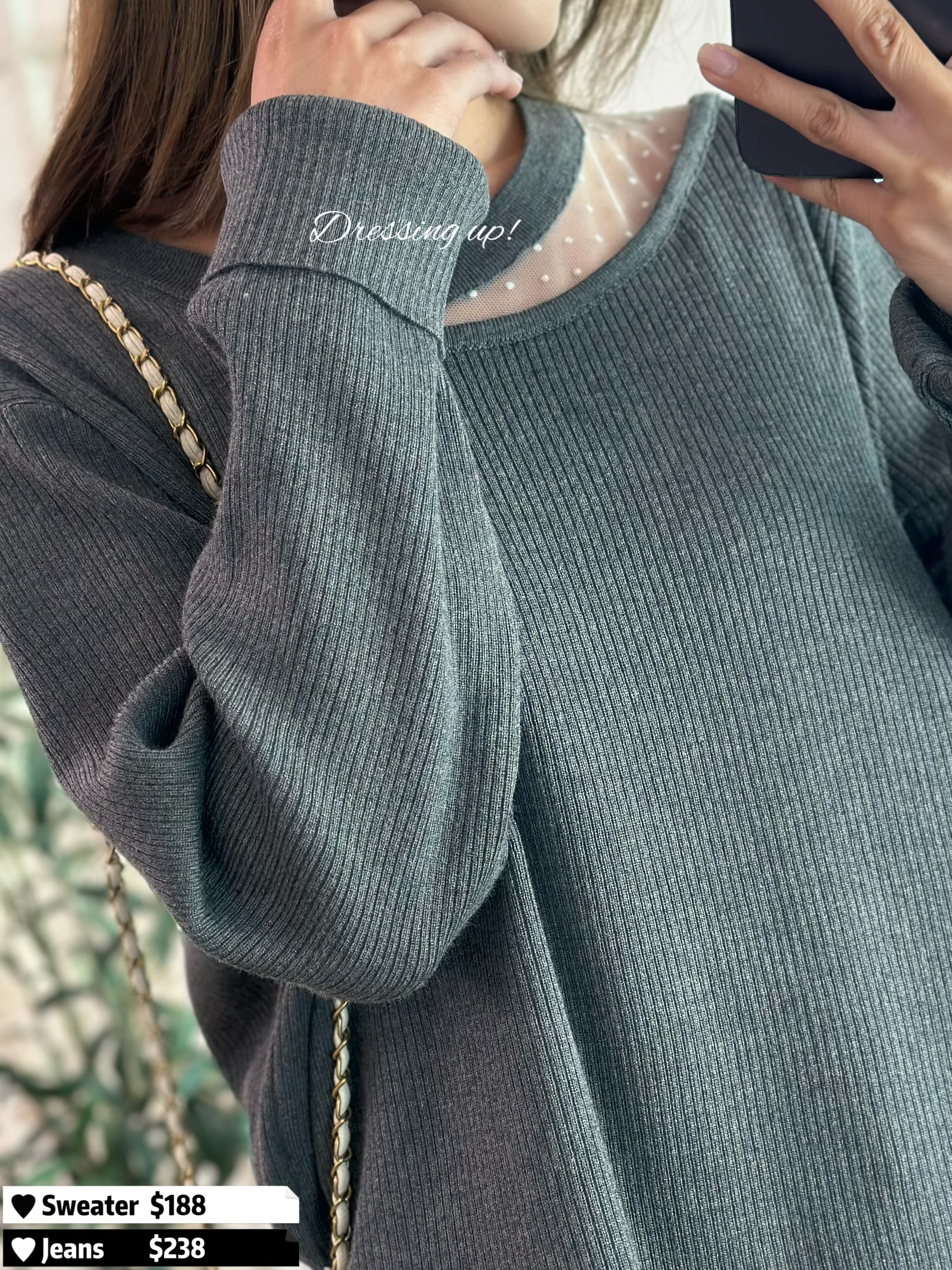 #手工之作 〰️ 很用心的氣質款 😍🫶🏻 深灰色彈性針織 為有肉地而設嘅剪裁 腰位46拉到62吋㗎 😌😌😌 全件耐穿免熨料 重點:領位拼上波點網紗 無需打底,方便又靚靚 ! 🆕 手工之作|拼網紗針織上衣 🆕 胸46-62吋/腰46-62吋/長66cm
