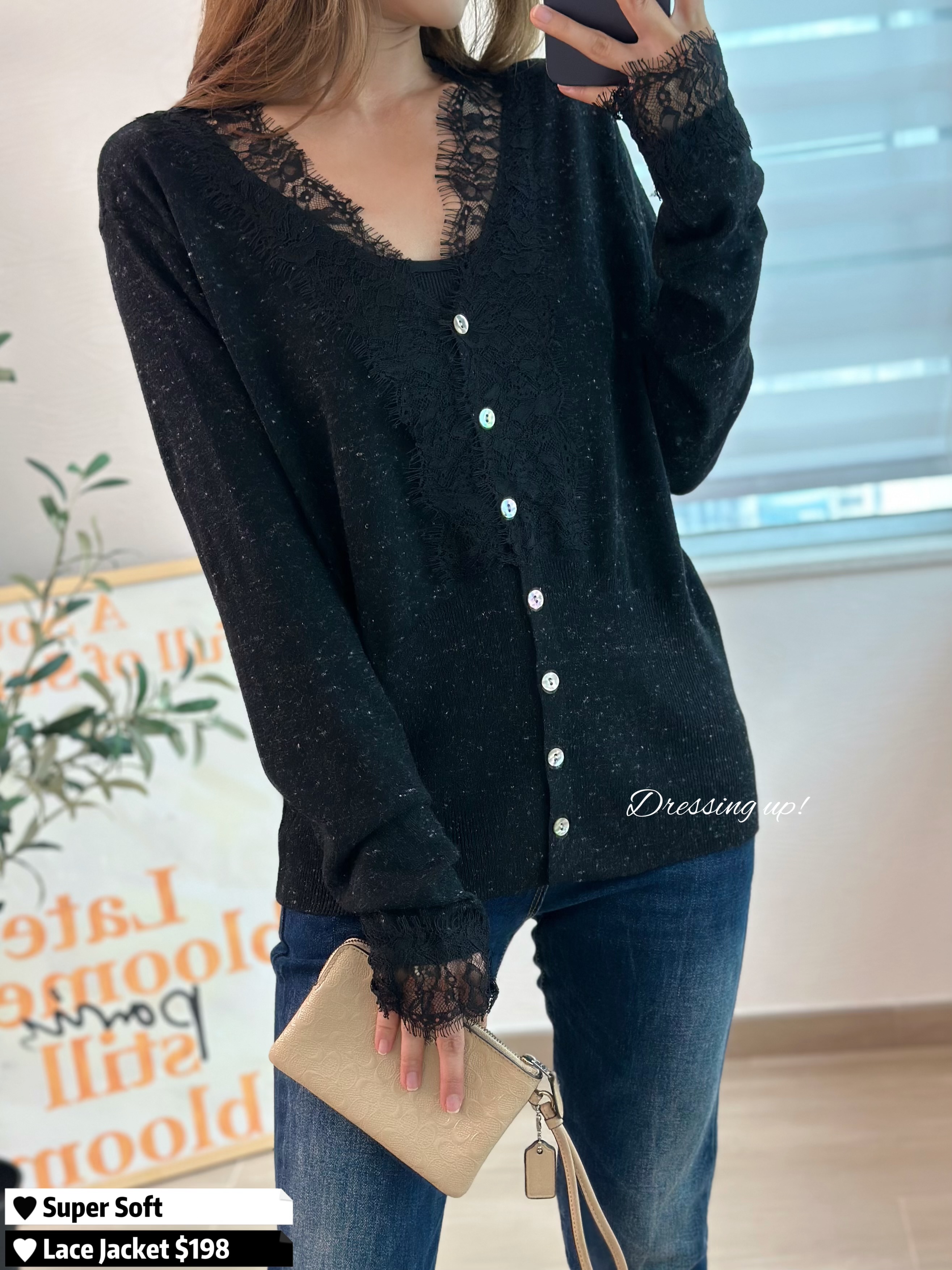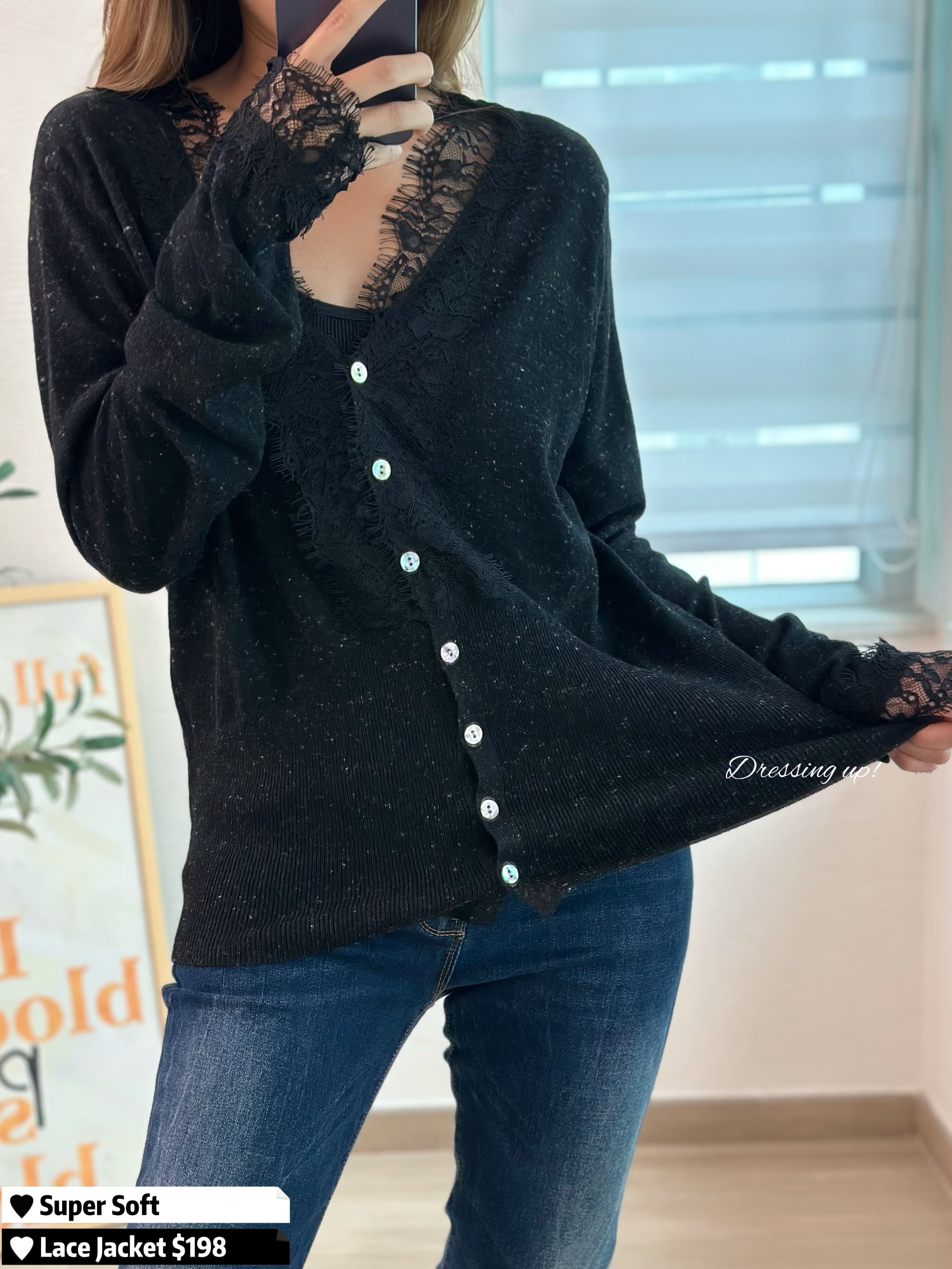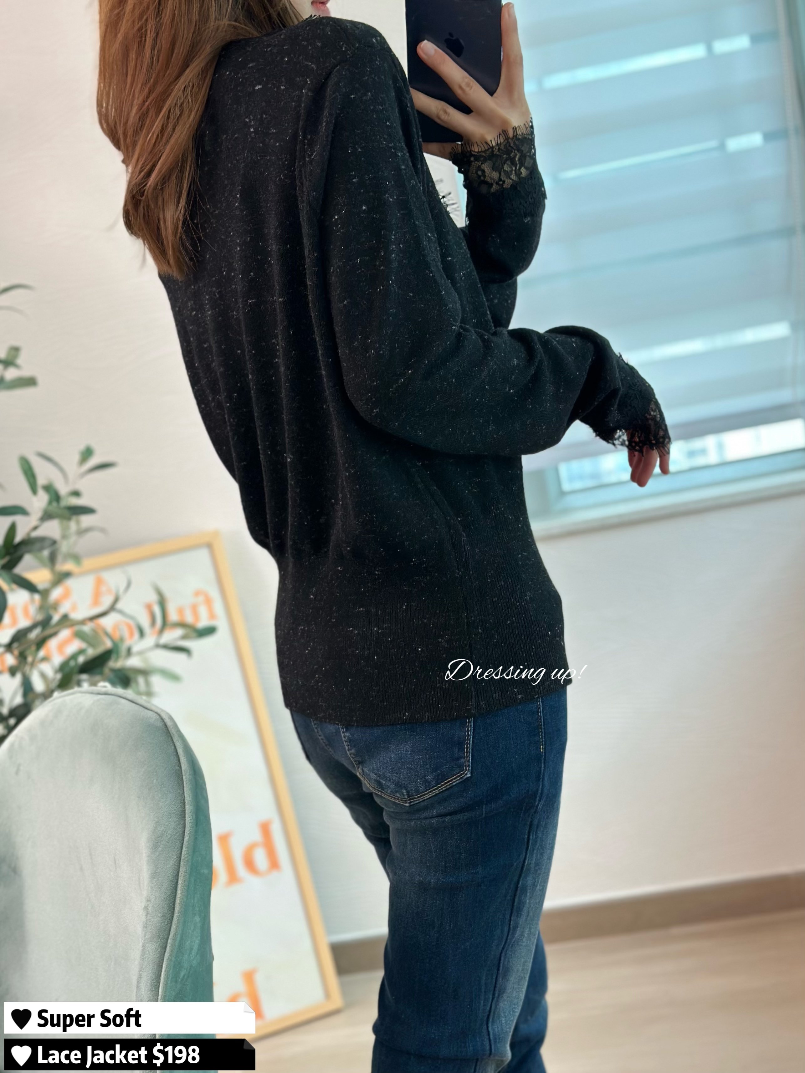 #黑夜星辰 ⭐️ 靚到不能自拔 🤤🤤🤤 可做上衣、可做外套 衫身混入星光閃線,低調中閃爍 手袖都拼埋LACE,實物超靚囉! 高質靚料、軟棉棉勁親膚 款式質素同樣高級 襯條窄牛已經靚到爆 😍🫰🏻 🆕 黑夜星辰|閃線線仔外套 🆕 胸40-50吋/腰32-42吋/長57cm