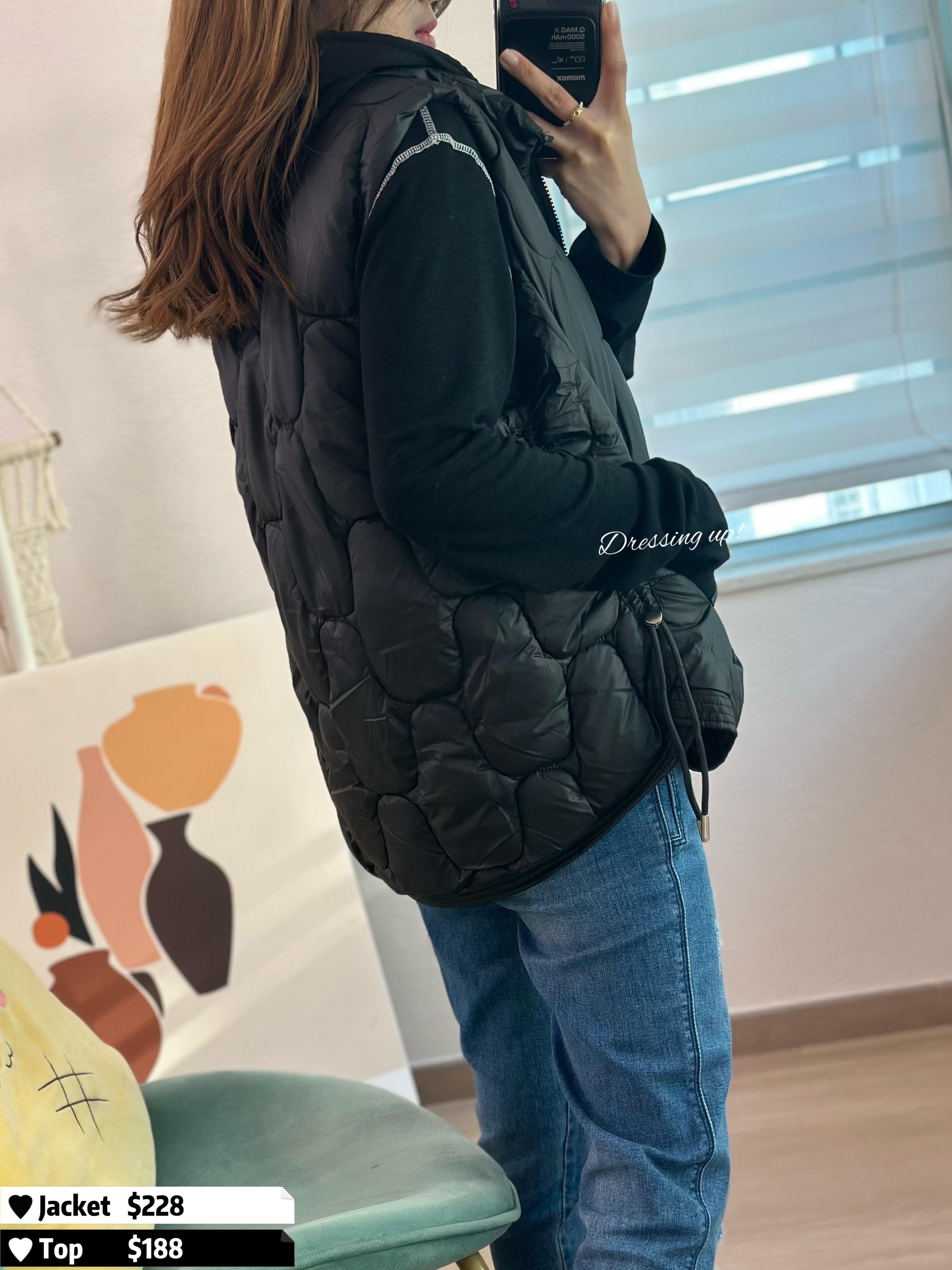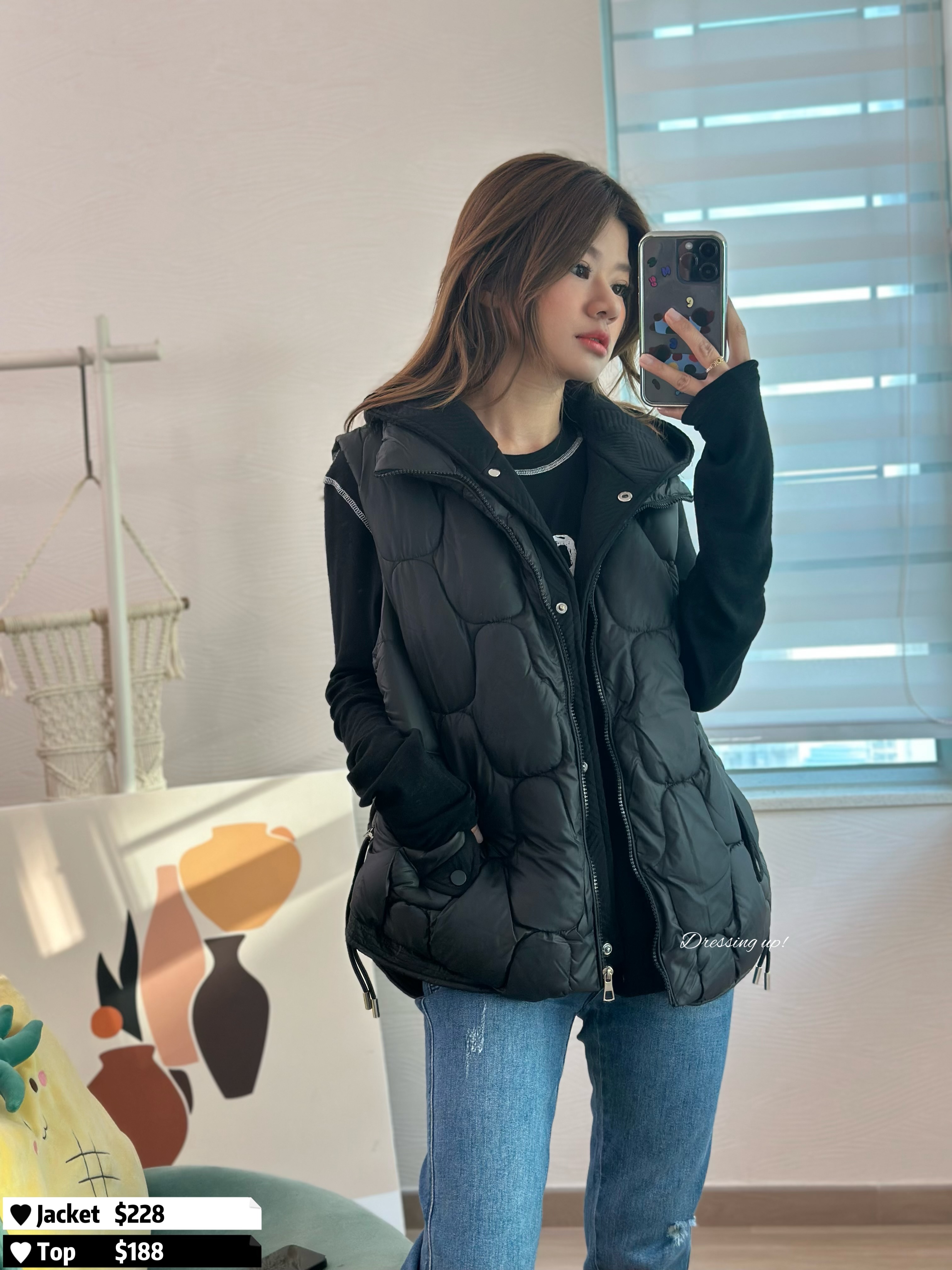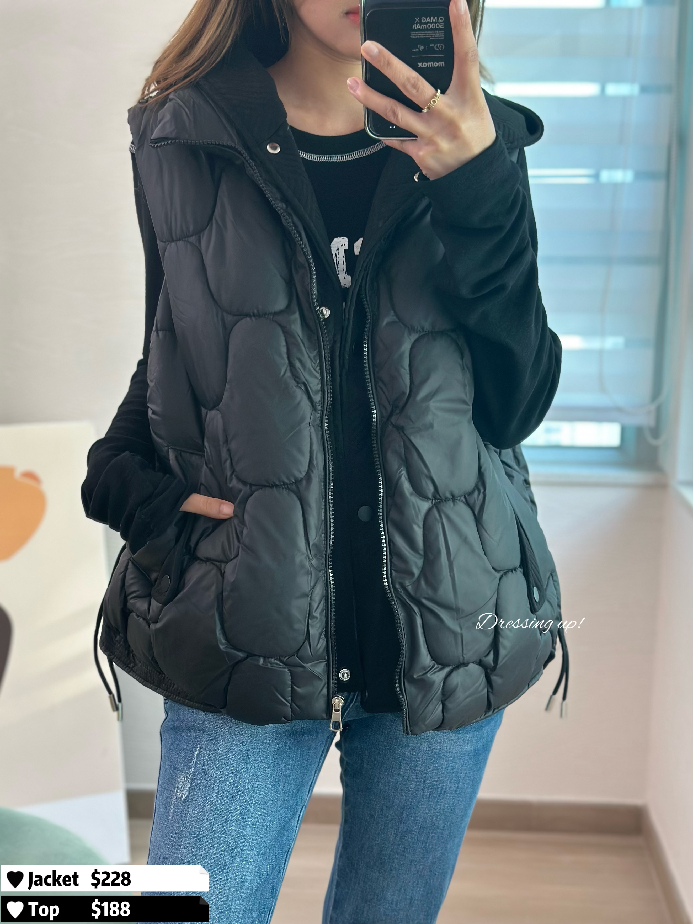 #不單調夾棉 👈🏻 又有型仔背心褸嘞 😍👄 假兩件雙層拼接 橢圓形夾棉、拼上壓紋帽仔 夠暖仲好輕身喎 ~~~ 兩側有袋、有型有款有層次 設計別出心裁 😘♥️ 重點:腰位48吋!有肉地要買! 🆕 不單調設計|拼接夾棉背心褸 🆕 胸44吋/腰48吋/長59cm