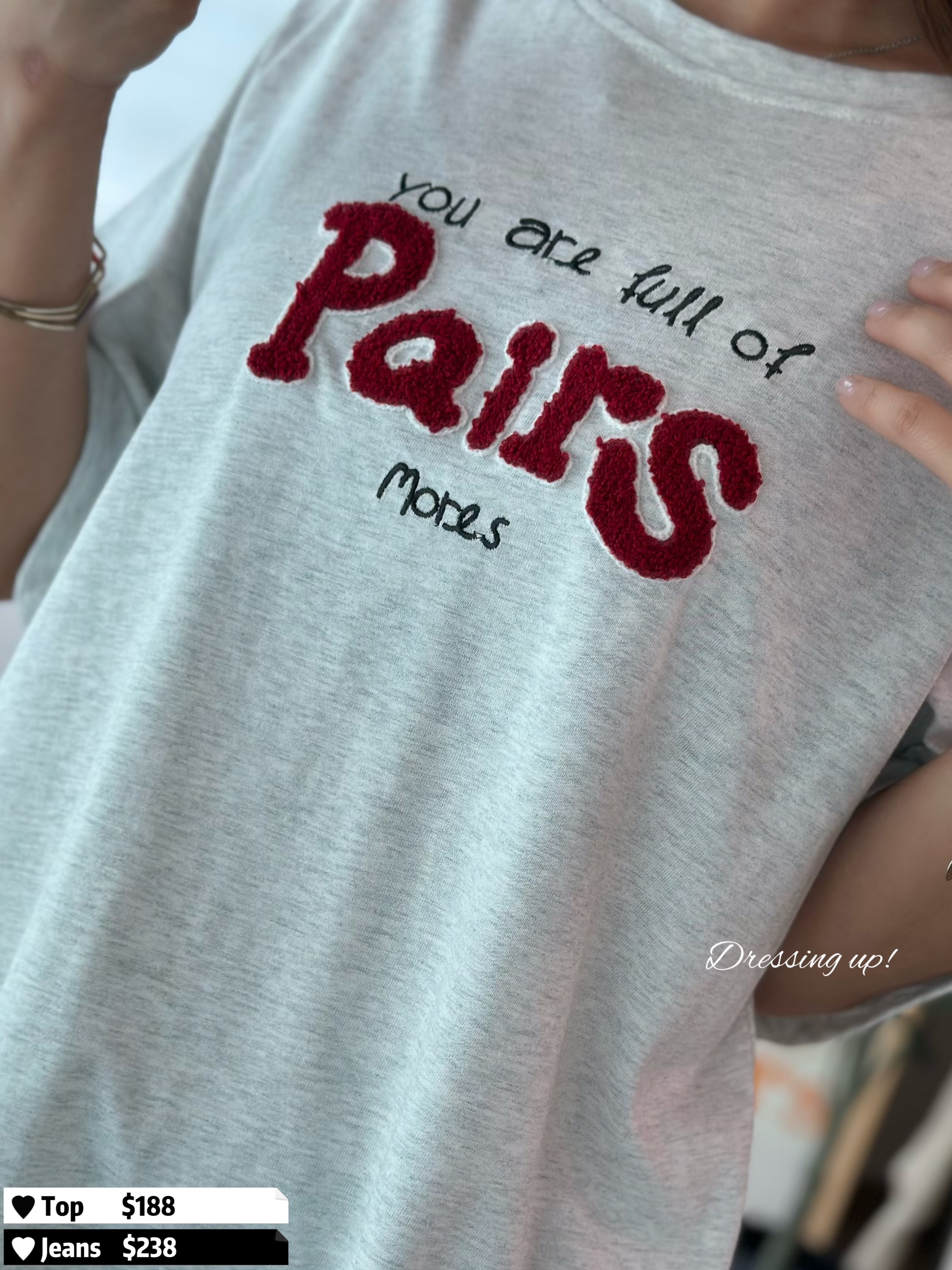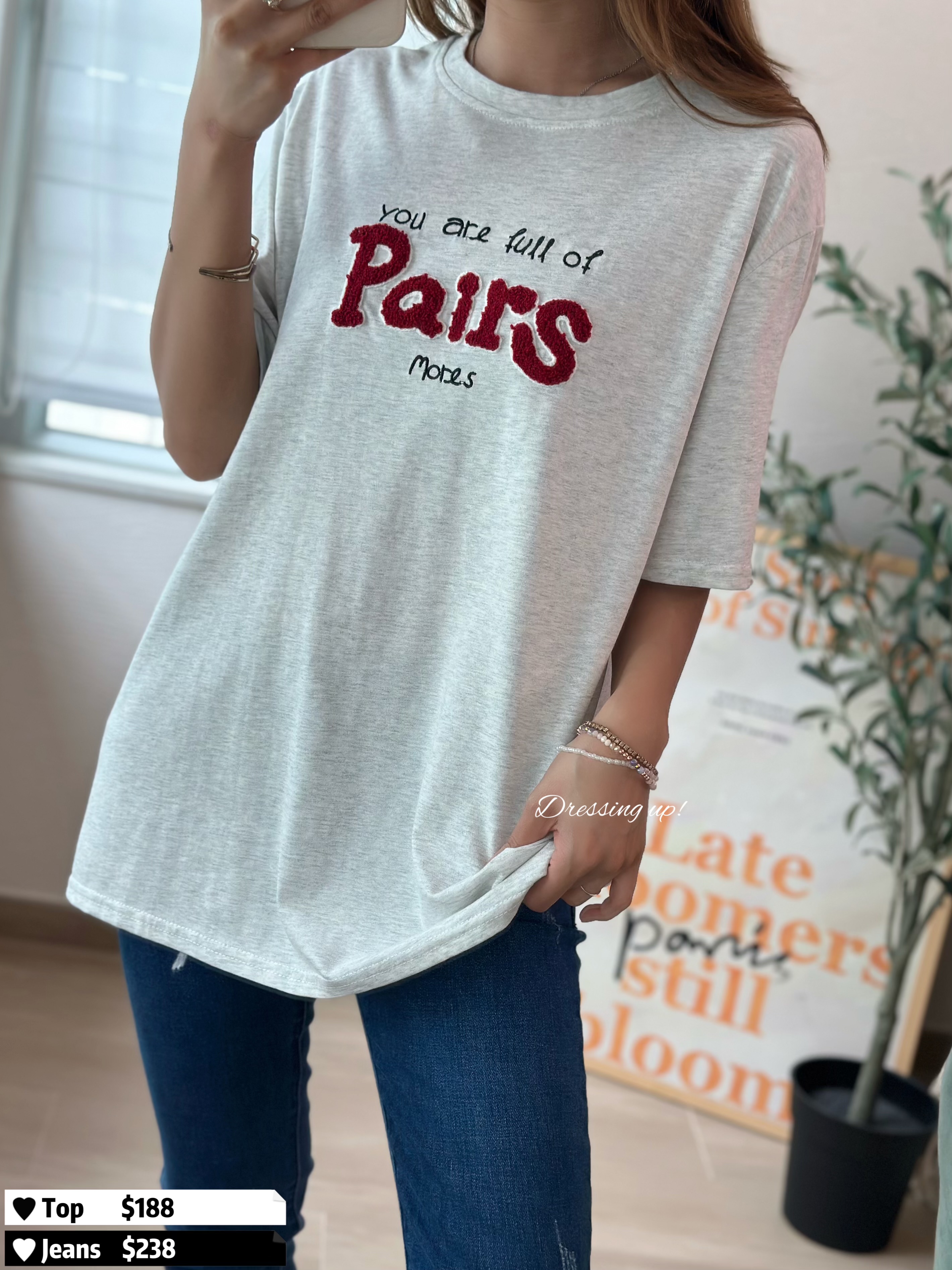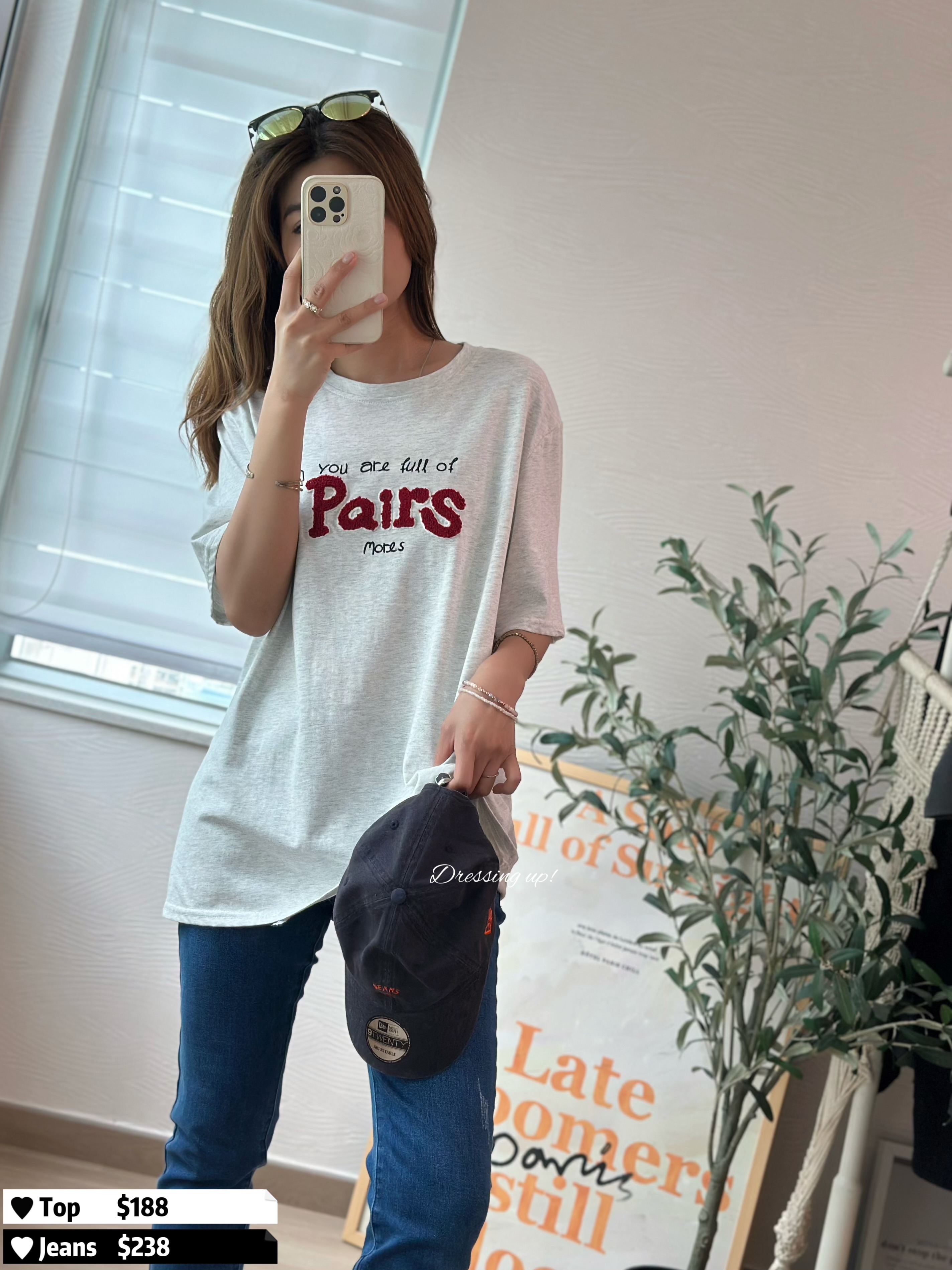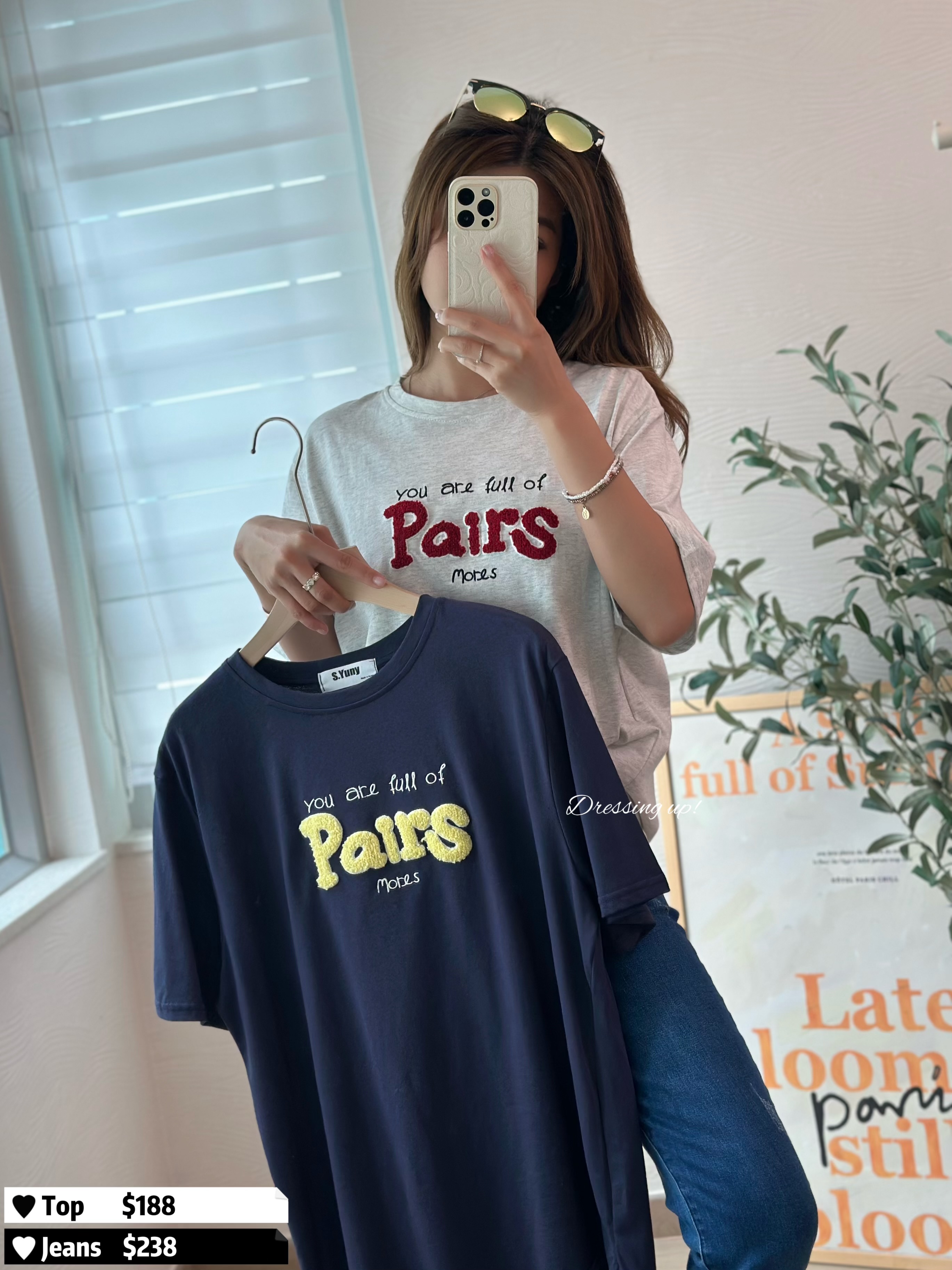 #搶眼之作 ☄️ 𝕐𝕠𝕦 𝕒𝕣𝕖 𝕗𝕦𝕝𝕝 𝕠𝕗 𝕡𝕒𝕚𝕣𝕤 𝕞𝕠𝕣𝕖 😝🙌🏻 淨色𝐓𝐞𝐞買得多 今次用上搶眼繡字 😍 係咪好有驚喜先~~ 日系雲石灰:紅色繡字 顯瘦寶藍色:黃色繡字 輕薄軟棉料、舒服又特別 😆🫶🏻 🆕 搶眼之作|繡字軟棉上衣 🆕 胸42-48吋/腰42-48吋/長67cm