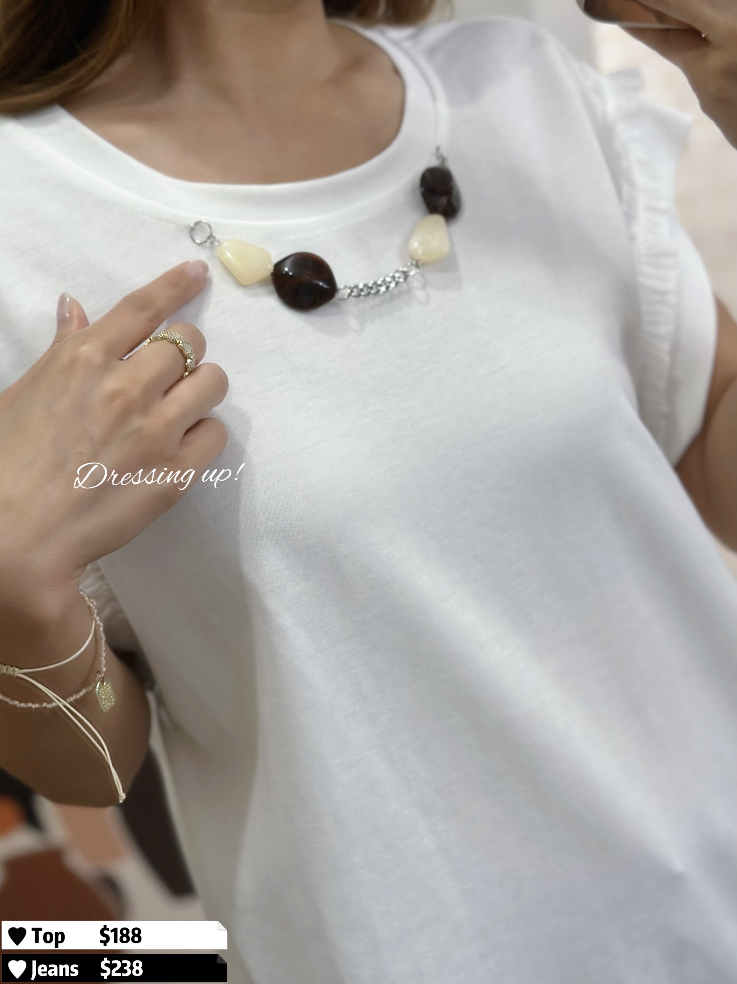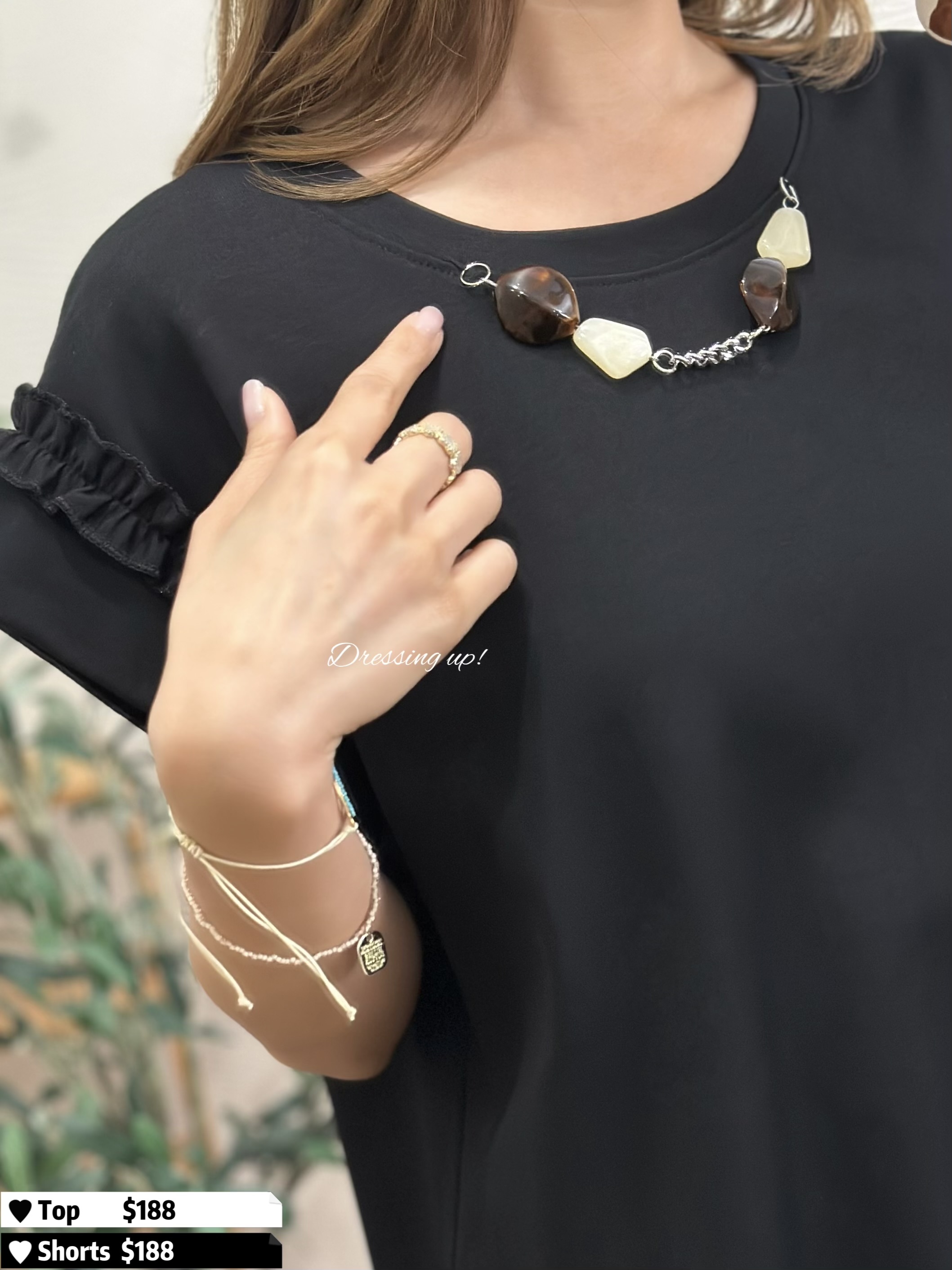 #精緻加分 ✨ 懶到頸鏈都幫妳襯埋 😆💫 純色軟棉上衣 釘上大理石頸鏈、設計加分 手工仲好細緻添!! 不得不讚:背面小扭結 前後左右都有款 ~~~ 示範兩個襯法都咁靚 😙😙😙 🆕 精緻加分|大理石頸鏈上衣 🆕 胸42-48吋/腰42-48吋/長59cm