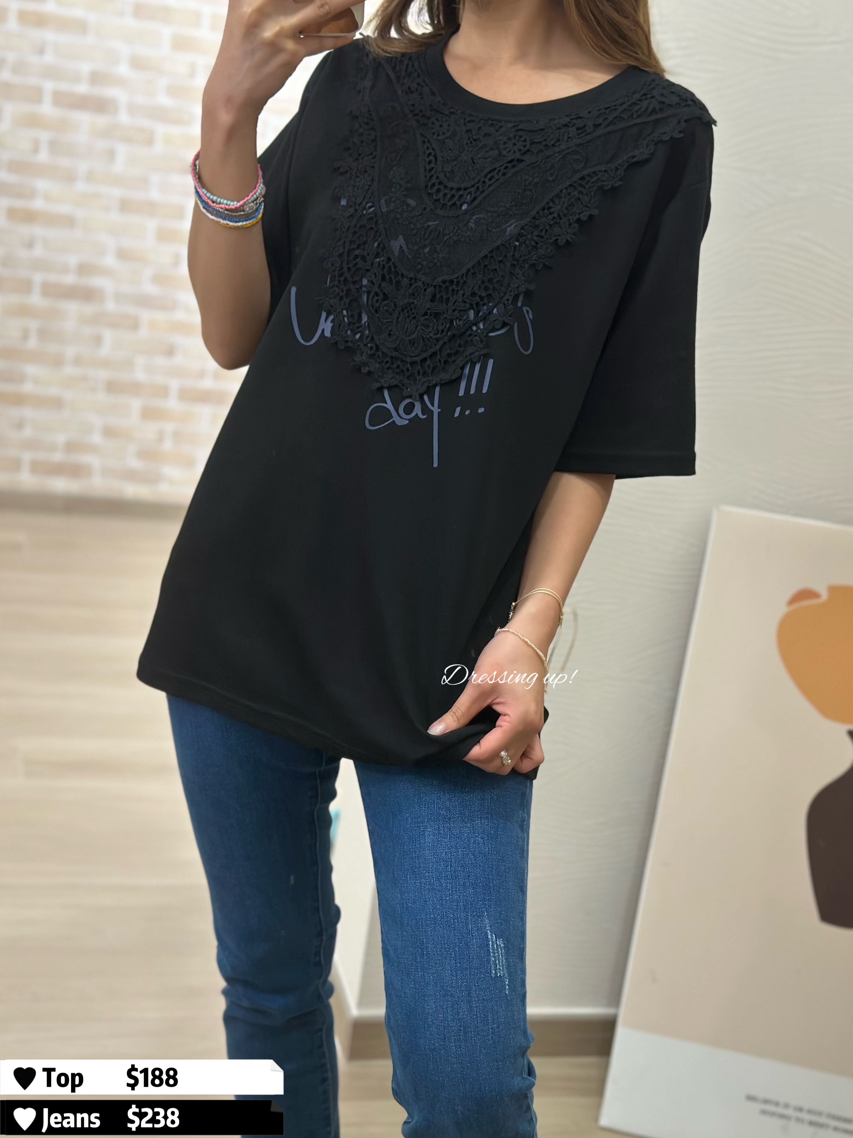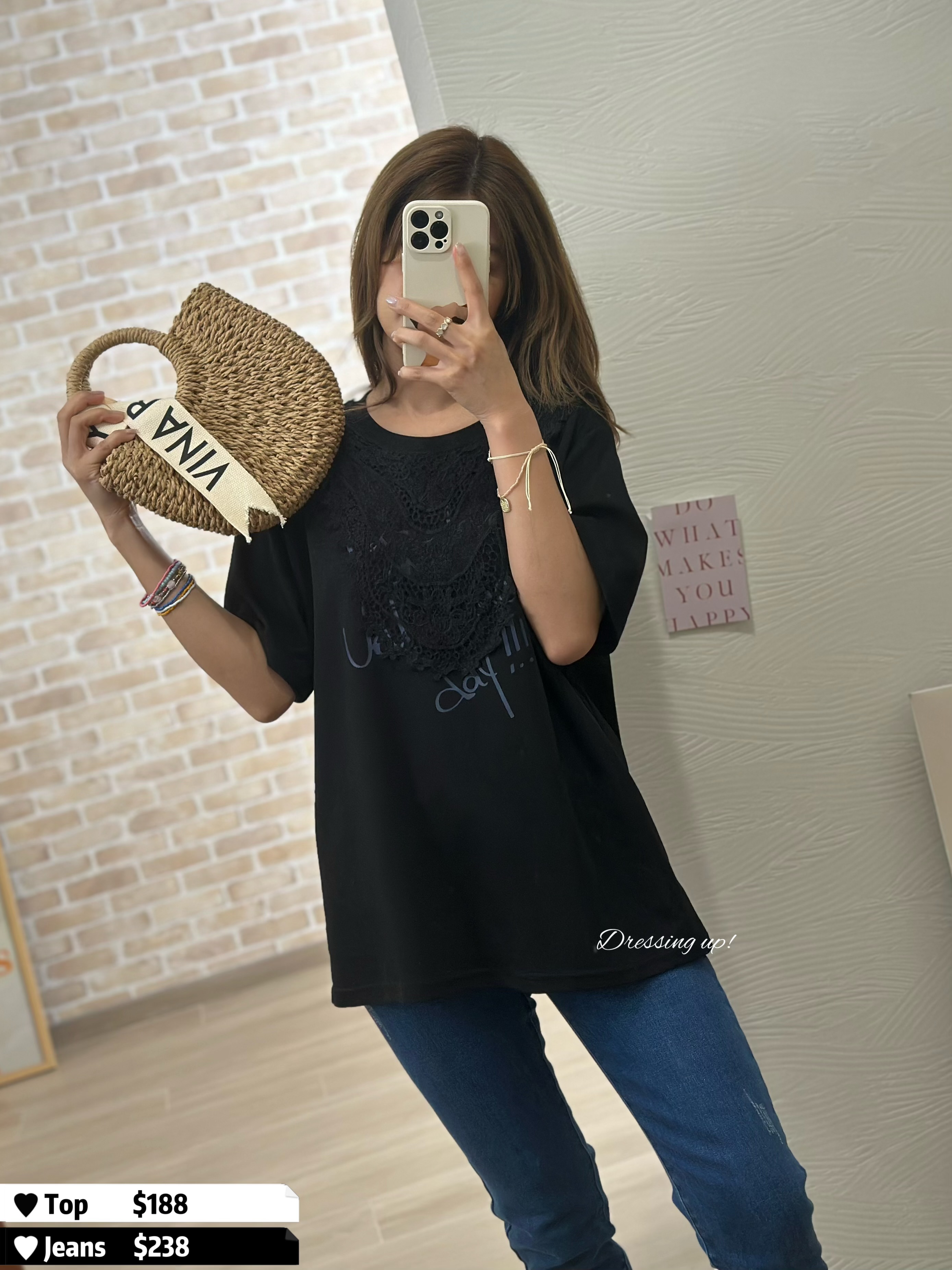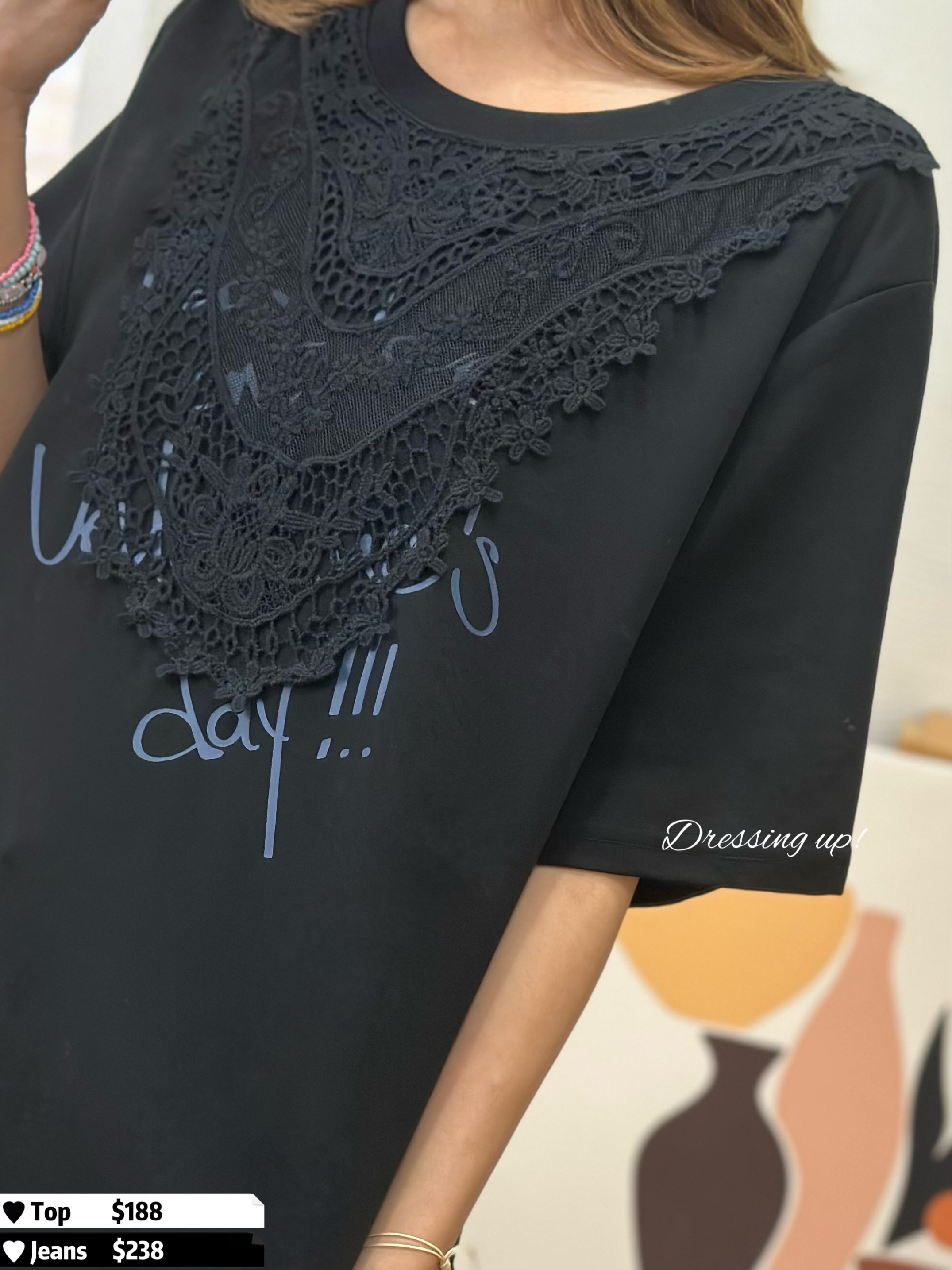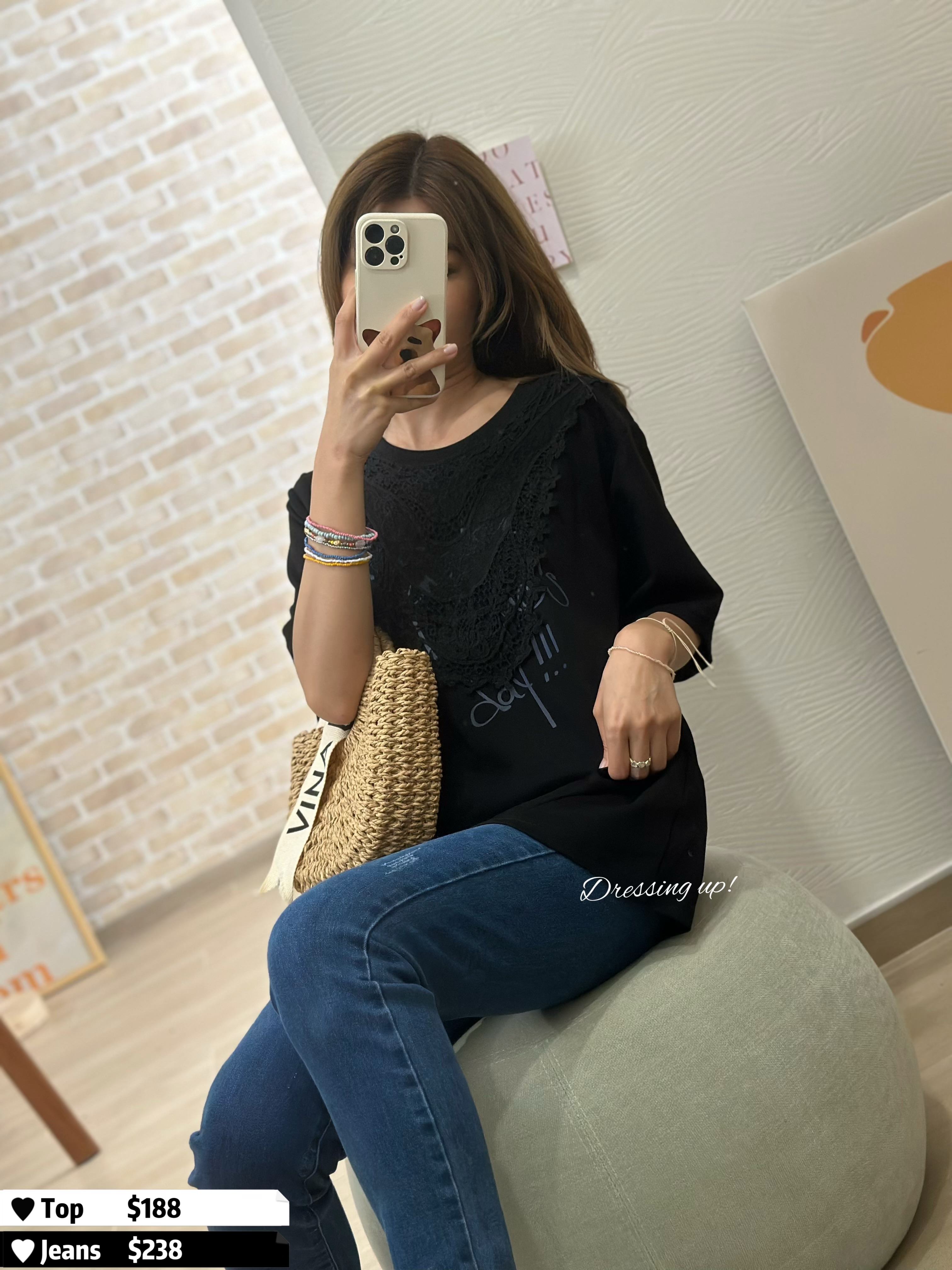 #高質靚料 ✌🏻 LACE也可以好休閑 🥰💗 黑色軟棉靚料 印字與LACE完美融合 價錢同質素都好吸引囉~~~ 衫身42吋,質地柔軟到爆 全件有彈性~~ 襯牛仔褲都有氣質 😘🫶🏻 🆕 高質靚料|LACE印字上衣 🆕 胸42-48吋/腰42-48吋/長66cm